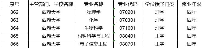 2021年3月1日,教育部公布了国内高校新增备案本科专业名单,西湖大学提交的五个本科专业位列其中,包括3个理学专业,即物理学、化学、生物科学;以及2个工学专业,即电子信息工程、材料科学与工程。
