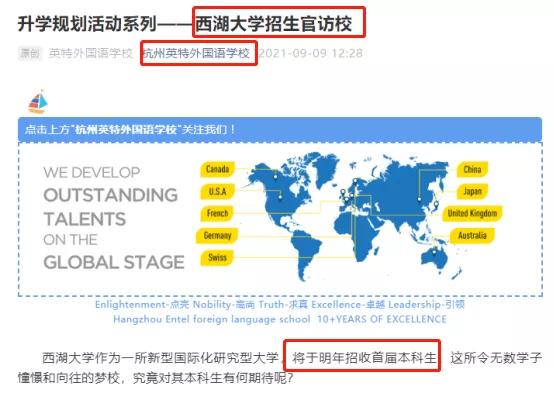另外,根据杭州英特外国语学校9月9日官方消息,西湖大学招生官曾在今年9月8日前往该校交流访问,并提到,西湖大学将于明年招收首届本科生。