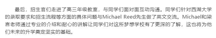 文章中还提到,西湖大学招生官们走进了高三年级教室, 针对西湖大学的录取要求和招生流程 等方面做了英文交流。