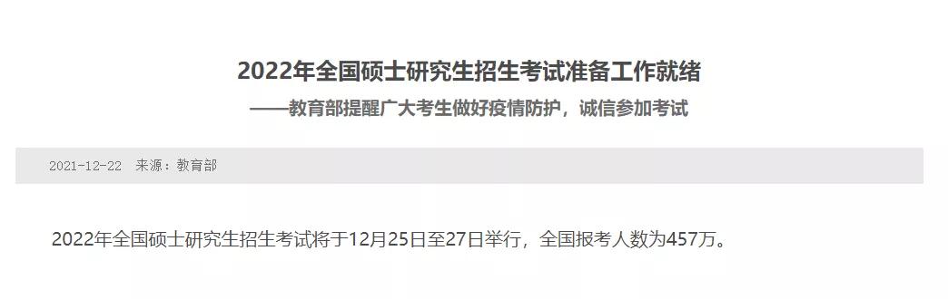 2022年全国硕士研究生招生考试将于12月25日至27日举行,全国报考人数为457万。