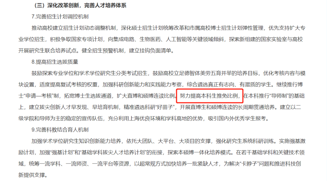 8月23日,上海市三部门联合印发了《关于加快新时代上海市研究生教育高质量发展的实施意见》,其中明确,上海市将努力提高本科生推免比例,在本科推行“导师制”的基础上,建立拔尖创新人才早发现、早培育机制,精准遴选科研“好苗子”,开展直博生和硕博连读的长周期贯通培养。