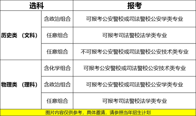总结一下,要想报警校将来当警察,怎么选科。文科的考生,必须选政治才可以报考公安警校,不选政治,只能报司法警校,而且是司法警校里的法学类专业。理科的考生,如果选了化学,可以报考警校的公安技术类专业,如果选了化学,也选了政治,就是物化政的组合,报警校就是通吃了,没有任何的障碍。理科考生如果没选化学,但选了政治,比如物理、政治、生物,物理、政治、地理,可以报考警校公安学类的专业。