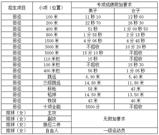1.高级中等教育学校毕业,获得国家二级运动员(含)以上证书,并且高中阶段在省级(含)以上比赛中获得排球项目前六名的主力队员或田径项目前三名者;