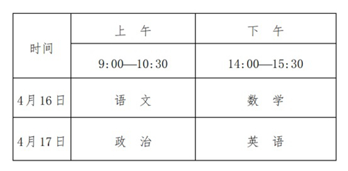 文化课考试科目为语文、数学、政治、英语;考试分值:每科150分,总分600 分,使用国家通用语言文字作答。考试时间: