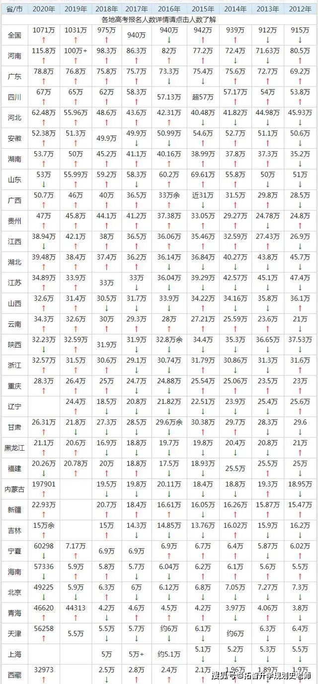 2020年高考报考人数1071万,近期,已经连续几个省市公布了2021年高考报考人数,人数再创新高,想必今年又是一个人数暴增的高考大年。