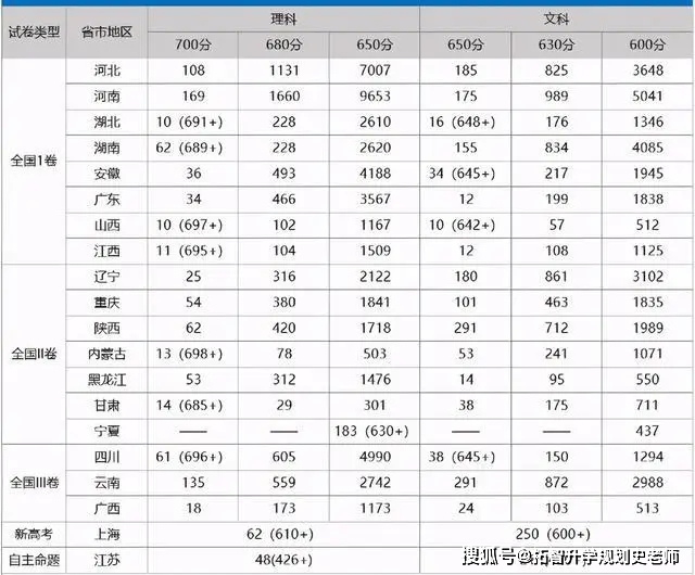 2020年各省高分段人数统计