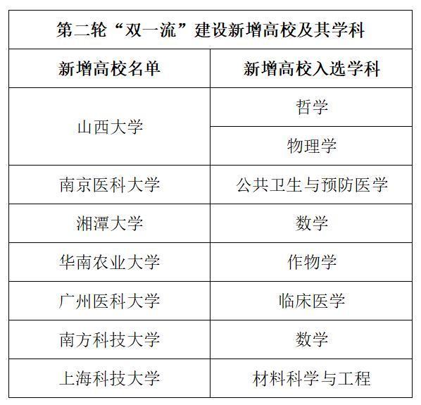 相比2017年公布的首轮名单,入围新一轮“双一流”建设名单的高校共新增7所,分别为南方科技大学、广州医科大学、华南农业大学、南京医科大学、上海科技大学、山西大学、湘潭大学。