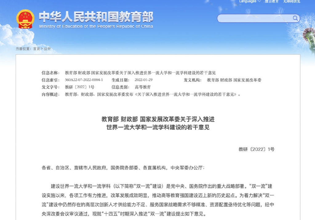 2022年2月14日教育部官网发布《教育部、财政部、国家发展改革委关于深入推进世界一流大学和一流学科建设的若干意见》,并配发了《关于公布第二轮“双一流”建设高校及建设学科名单的通知》。