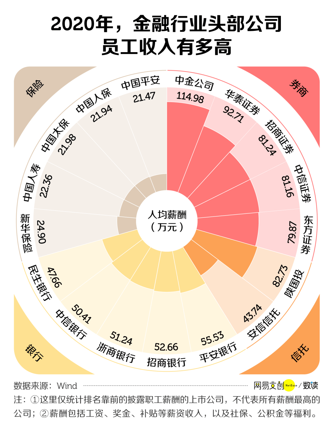 2020 年,中金公司的人均薪酬达到了 114.98 万,而排在它后面的其他券商公司薪酬也不低。根据第一财经的梳理,薪酬最高的 15 家券商公司,人均年薪都超过了 40 万元。