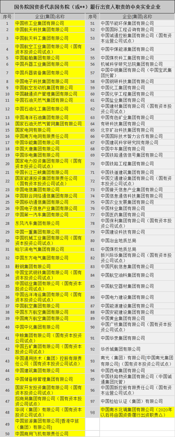 截至2021年2月22日,中央企业合计131户。其中,中管企业70户(黄色底纹)。