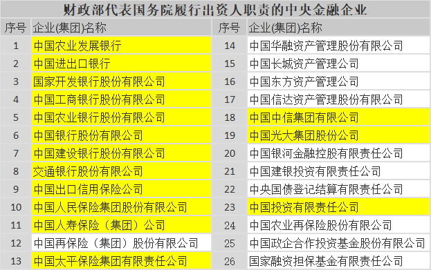 金融类央企大致有投资、银行、保险、信托等种类,如中国投资有限责任公司、中国中信集团公司、中国人寿保险集团公司、中国东方资产管理公司、中诚信托有限责任公司、中国科技证券有限责任公司、中国银行等银行。