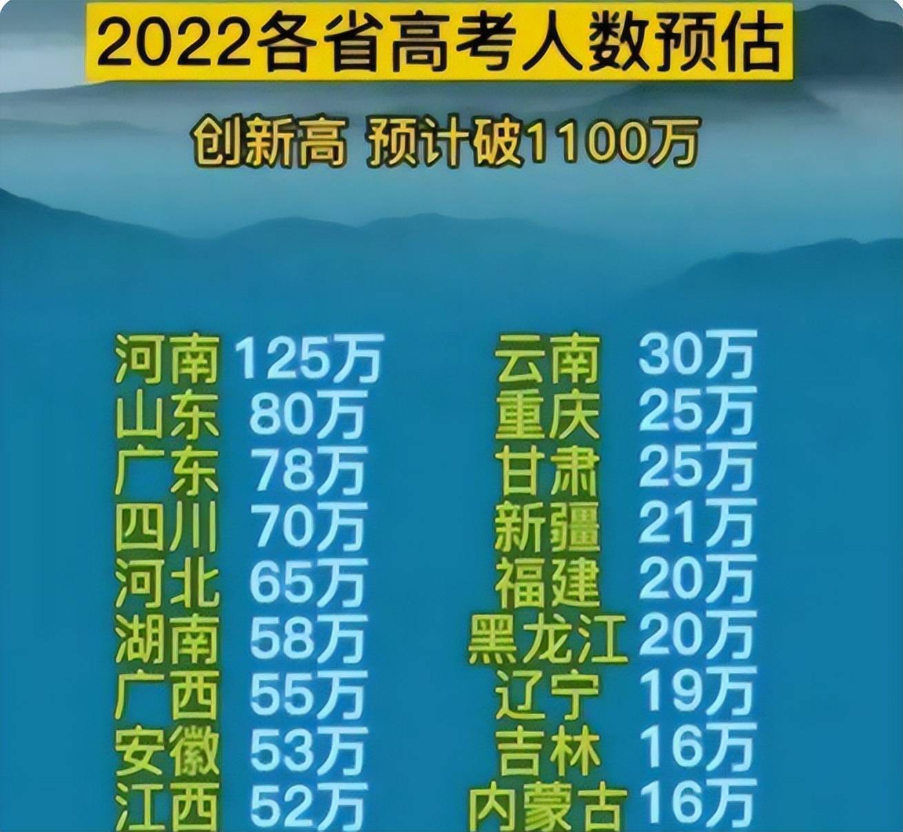 在正式公布2022高考报名人数之前,网上还流传了一个对2022考生人数的预估名单,预估是1100万,没想到真的是十分保险的预估。