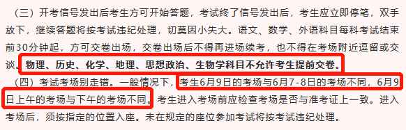 湖北省教育考试院发布《致全省普通高考考生的一封信》,其中提到:全国统考科目每科交卷出场时间不得早于该科目考试结束前30分钟,交卷出场后不得再进场续考;学业水平选择性考试科目不得提前交卷。