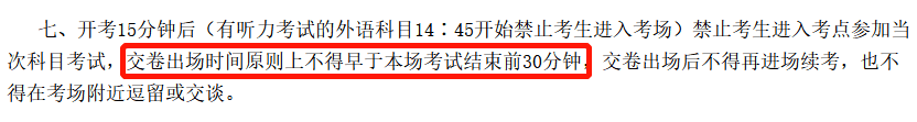 江西省2022年高考考场规则中提到:开考15分钟后(有听力考试的外语科目14∶45开始禁止考生进入考场)禁止考生进入考点参加当次科目考试,交卷出场时间原则上不得早于本场考试结束前30分钟,交卷出场后不得再进场续考,也不得在考场附近逗留或交谈。