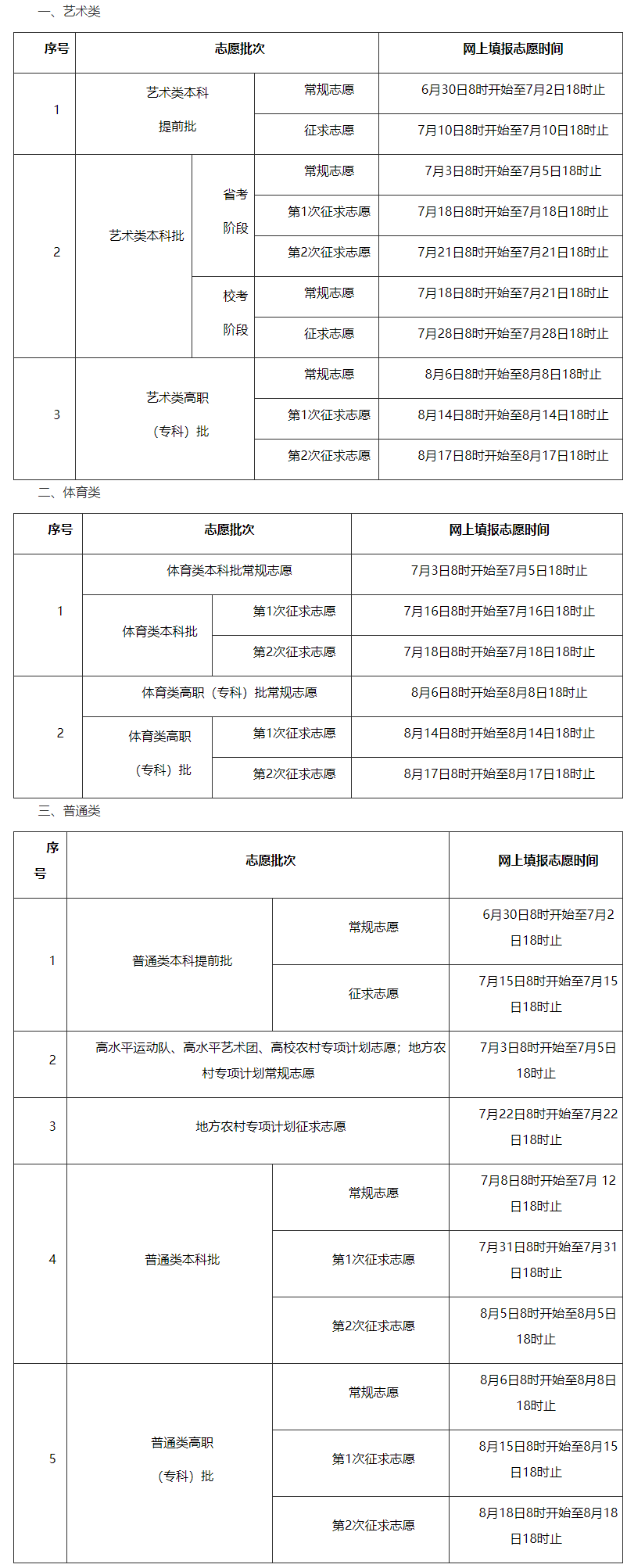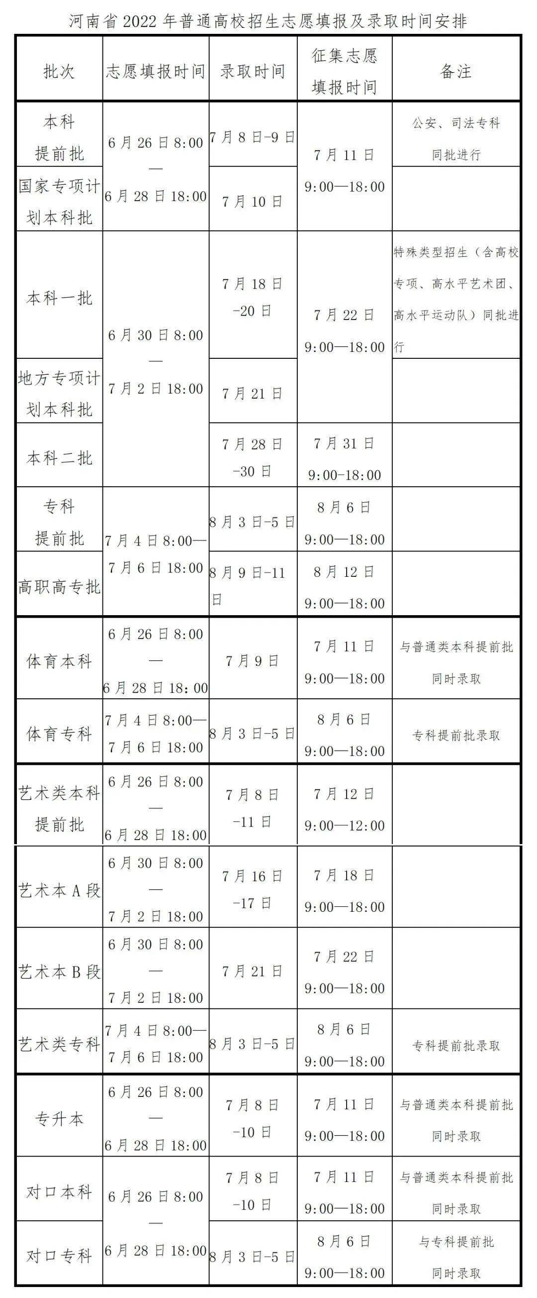 7月17日-19日:文史、理工类地方专项计划、特殊类型招生本科院校(含自主招生、高水平艺术团、高水平运动队、高校专项计划招生)