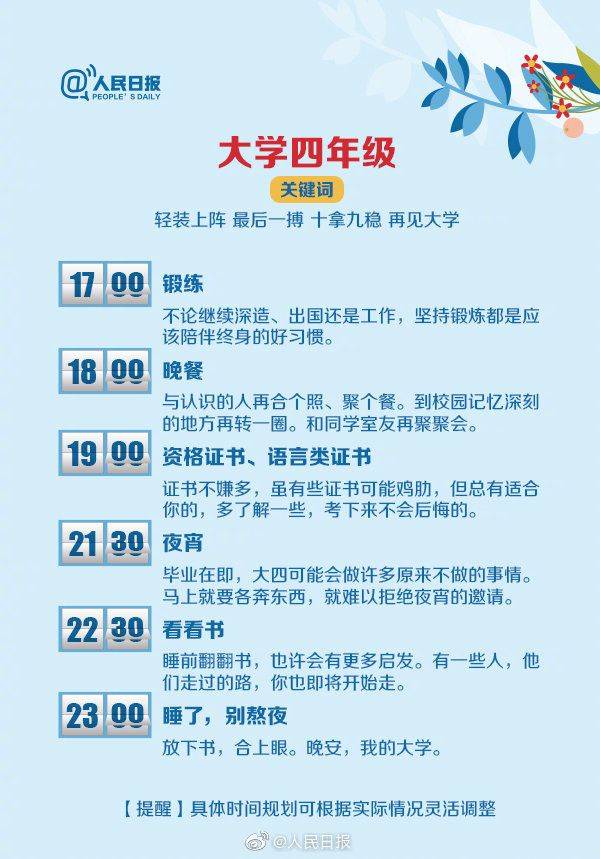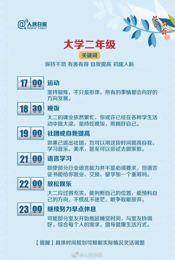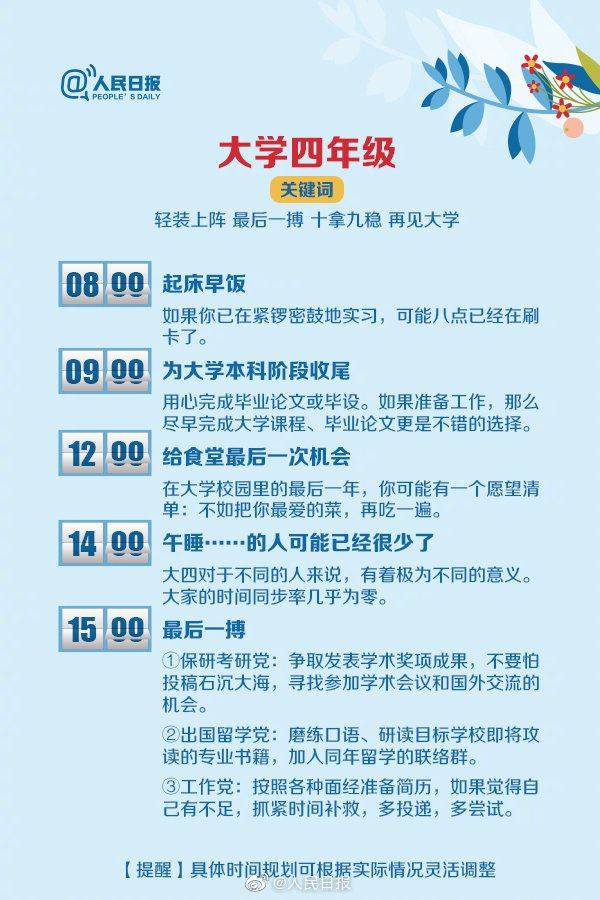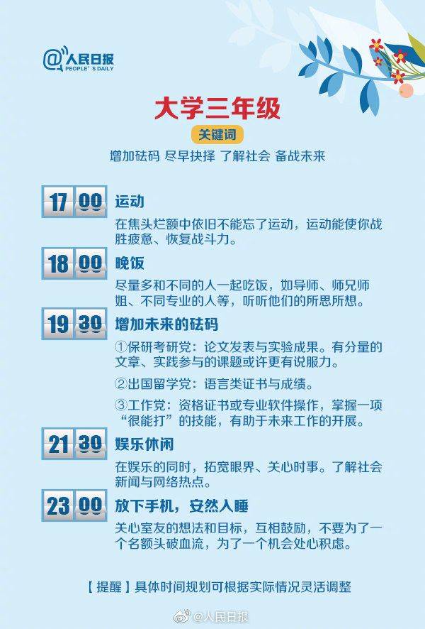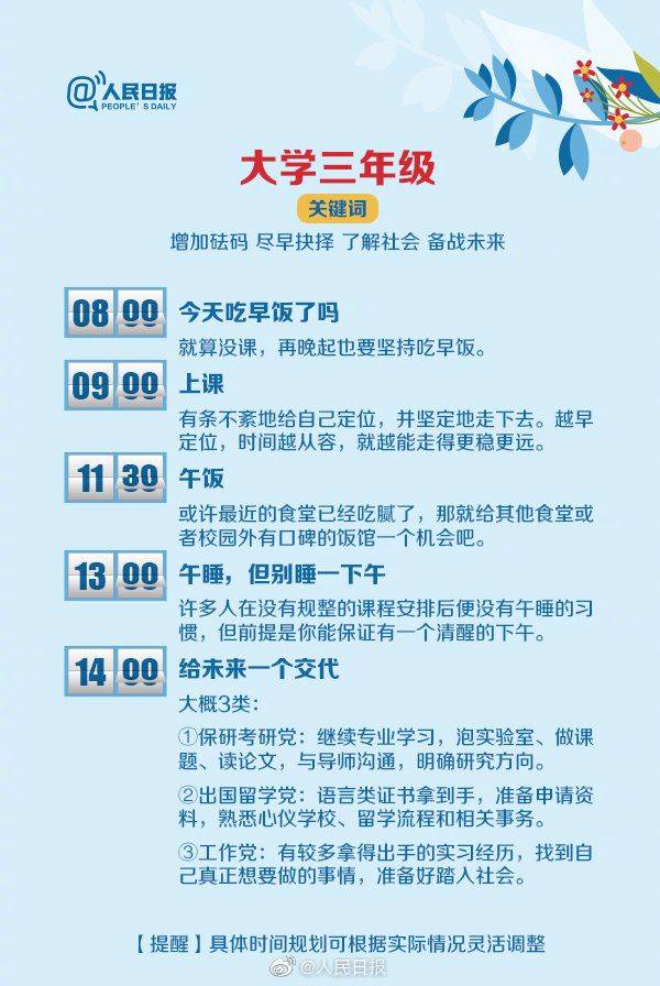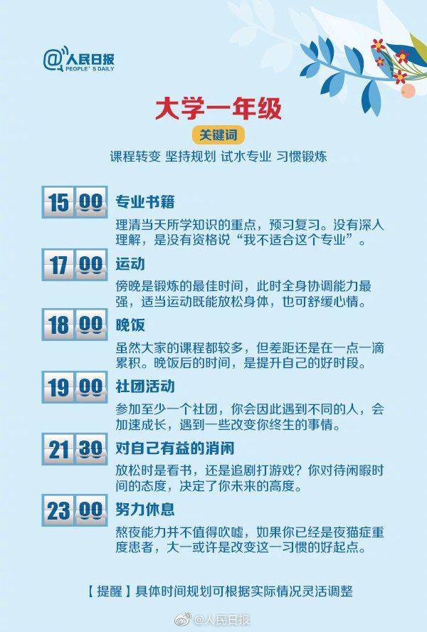 大学的每个年级都该明白自己的位置,清楚自己的方向:考证、考研、工作、出国留学…早些规划,将来就能多些选择。所以,建议同学们在一开始就结合自身志愿定好一个大方向,这样才能稳扎稳打,为以后的发展奠定良好的基础。定好目标,就要付诸行动,合理的时间规划是同学们迈向成功的基石,这份最佳作息表分享给你收藏备用吧↓↓↓