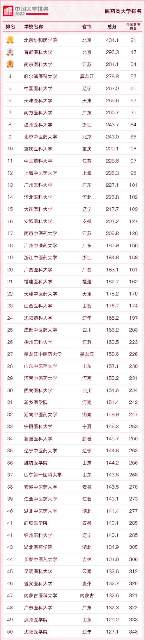 软科2022医药类大学排名TOP50