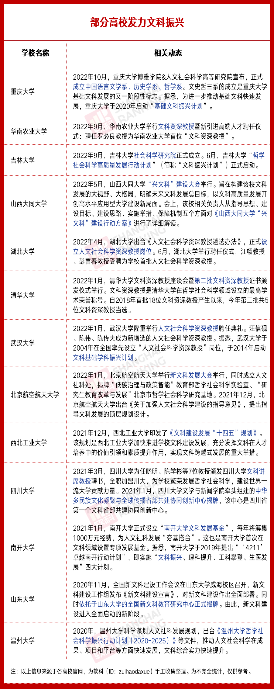 进入2022年,文科建设迎来鼎盛时期。不仅有中共中央连发《国家“十四五”时期哲学社会科学发展规划》《面向2035高校哲学社会科学高质量发展行动计划》两份重要文件,积极推动哲学社会科学稳步发展,更有包括重庆大学、华南农业大学、吉林大学、清华大学、武汉大学、北京航空航天大学等多所“双一流”在内的高校纷纷发力,推进文科加快发展。