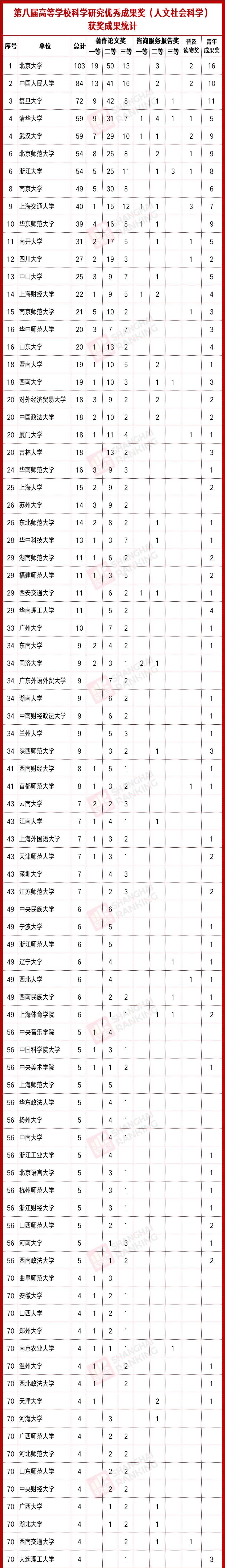 教育部人文社科优秀成果奖(第八届高等学校科学研究优秀成果奖(人文社会科学))是教育部为表彰和奖励全国高校哲学社会科学工作取得的卓越成绩,激励广大科研工作者严谨治学、勇于创新、锻造精品,推动高校哲学社会科学繁荣发展的重大举措。该奖自1995年首设以来,一直是我国人文社会科学领域最具公信力和影响力的奖项。第八届教育部人文社科优秀成果奖于2020年12月揭晓,北京大学、中国人民大学、复旦大学获奖成果数位列前三,体现了在人文社科领域强劲的实力和突出贡献。