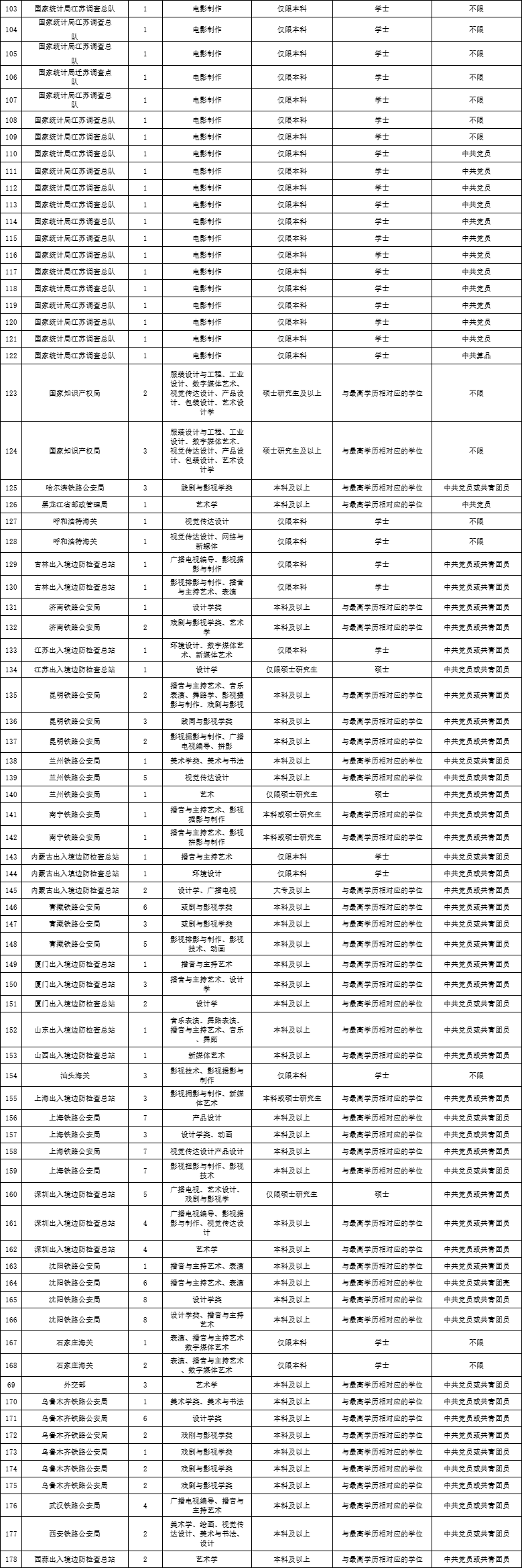 中央机关及其直属机构2024年度录用公务员艺术类毕业生可报考的岗位如下: