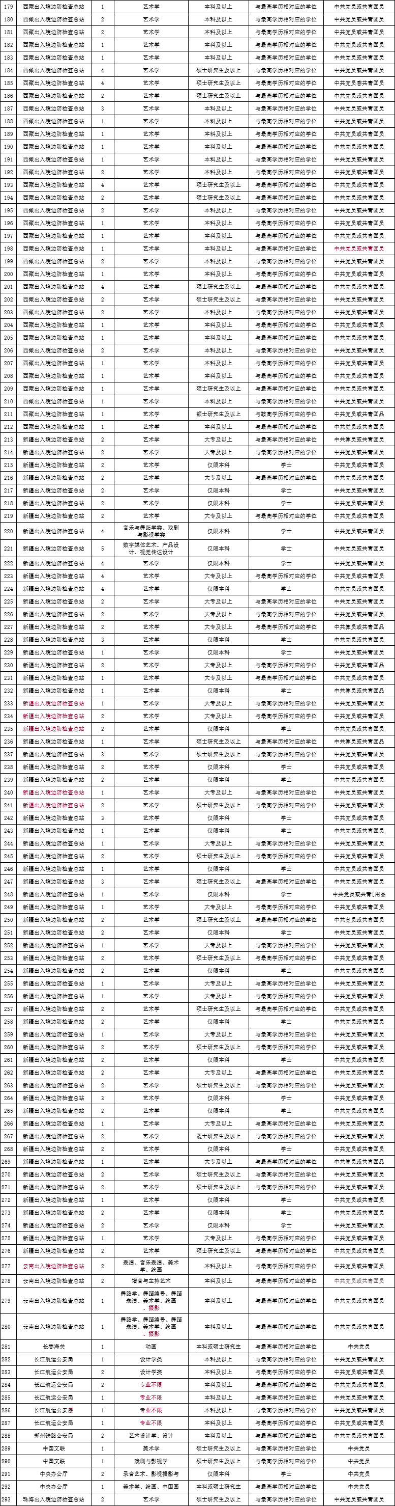 此次公务员招录,坚持大抓基层的鲜明导向,录用计划向基层倾斜,有近2.7万个计划补充到县(区)级及以下直属机构,但艺术生可报考的293个岗位中,有多达258个岗位对服务基层项目工作经历的没有要求,仅有35个岗位有服务基层的经历要求,其中,长江航运公安局的岗位要求,报考者必须为“在军队服役5年(含)以上的高校毕业生退役士兵”。