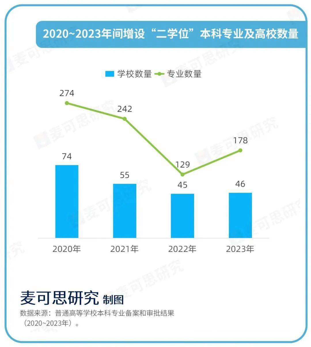 根据教育部公历年本科专业备案和审批名单,2020年~2023年间,已经有187所本科院校,合计增设二学位专业823个。