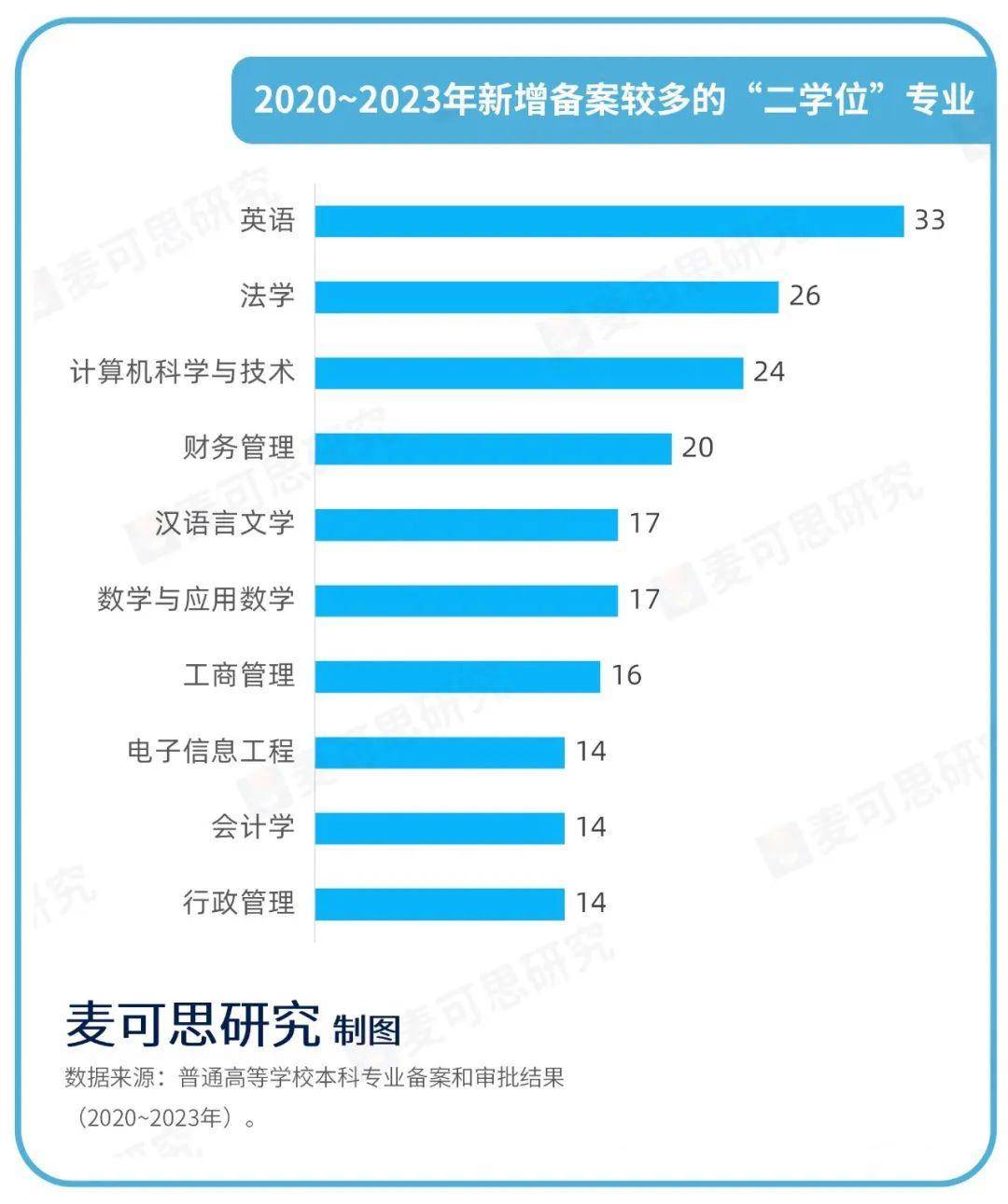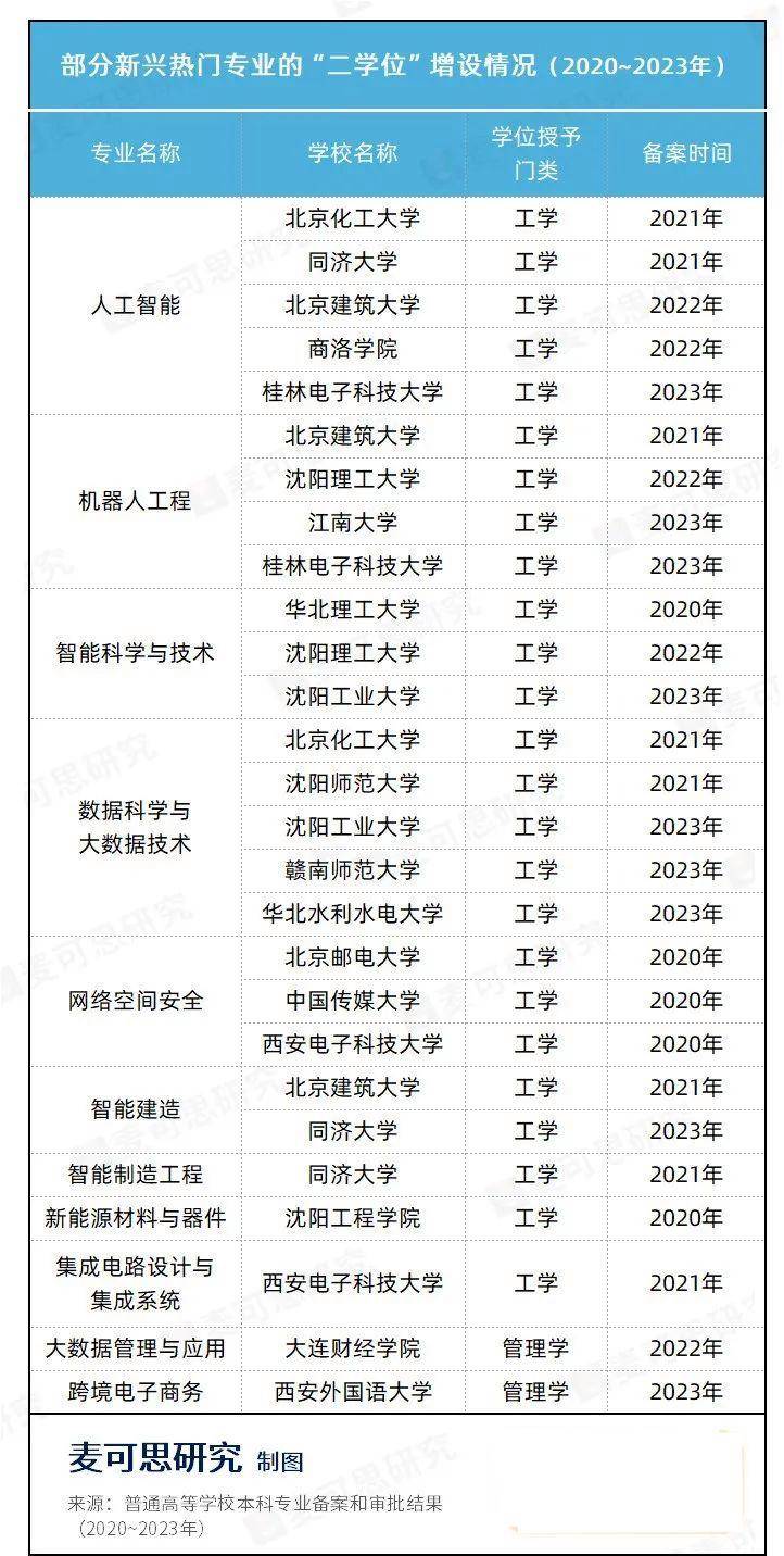 尤其是在2022~2023年新增备案二学位中,更多见到了数据科学与大数据技术、机器人工程、人工智能等新兴热门专业的身影。
