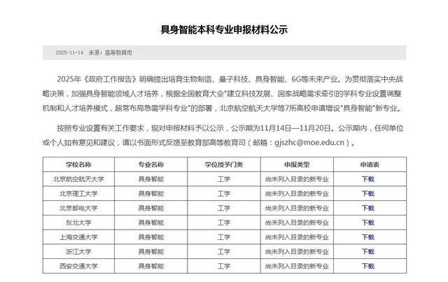 近日,教育部网站发布《具身智能本科专业申报材料公示》,北京航空航天大学、北京理工大学、北京邮电大学、东北大学、上海交通大学、浙江大学、西安交通大学等7所“双一流”高校申请增设“具身智能”新专业。这一举措旨在贯彻落实中央战略决策,加强具身智能领域人才培养,响应2025年《政府工作报告》中培育具身智能等未来产业的部署。