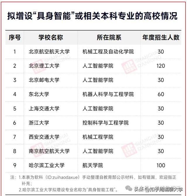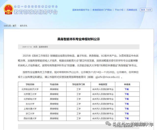 近日,一则看似常规的教育动态,在科技与产业界激起了巨大涟漪。11月14日,教育部政务服务平台公示,包括北京航空航天大学、北京理工大学、北京邮电大学、东北大学、上海交通大学、浙江大学、西安交通大学在内的7所双一流高校联合申请增设“具身智能”本科专业。这并非孤立事件,早在今年8月,南京航空航天大学和哈尔滨工业大学也已率先布局。短短数月,近十所中国顶尖工科院校不约而同地押注这一前沿领域,释放出一个再清晰不过的战略信号:中国正以超常规速度,为即将到来的智能体与现实世界深度交互的时代,构建核心人才基石。