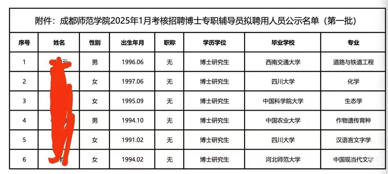 成都师范学院2025年1月初公示的博士专职辅导员拟录用名单,引发了热议。名单中显示,四川大学有2名博士、中国农业大学有1名博士、中国科学院大学有1名博士、西南交通大学有1名博士、河北师范大学有1名博士。