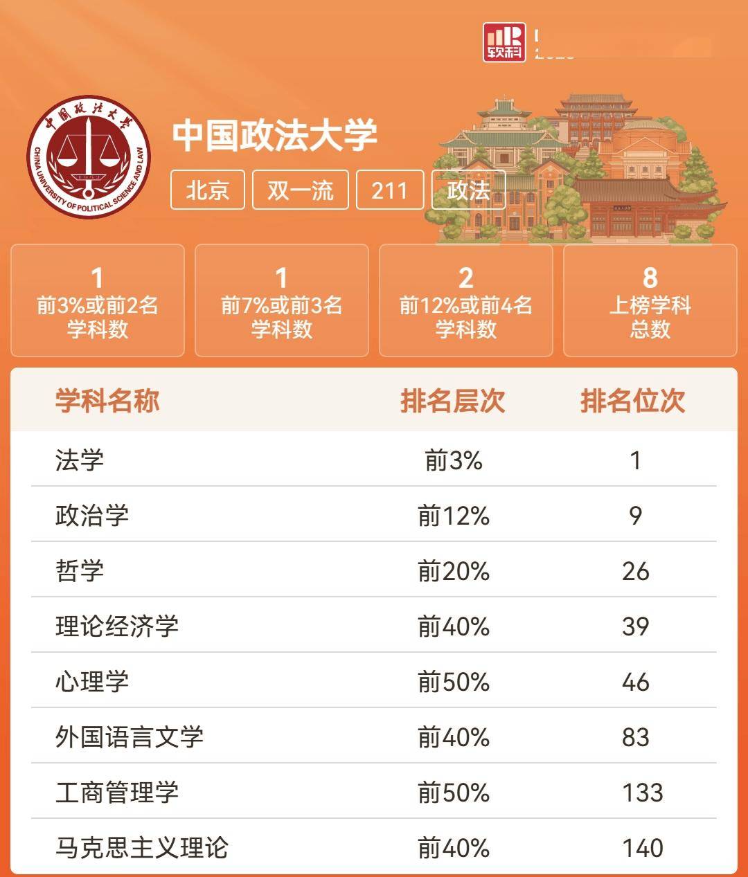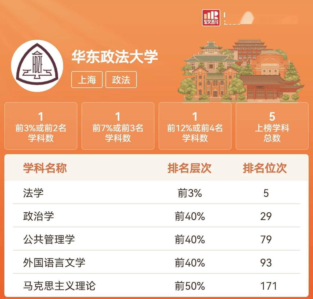 另外还有两类院校,虽然不在软科世界学科排名上,但也是公认的单科强势大学,软科上也有数据支持,那就是政法类和艺术类的几所学校——
