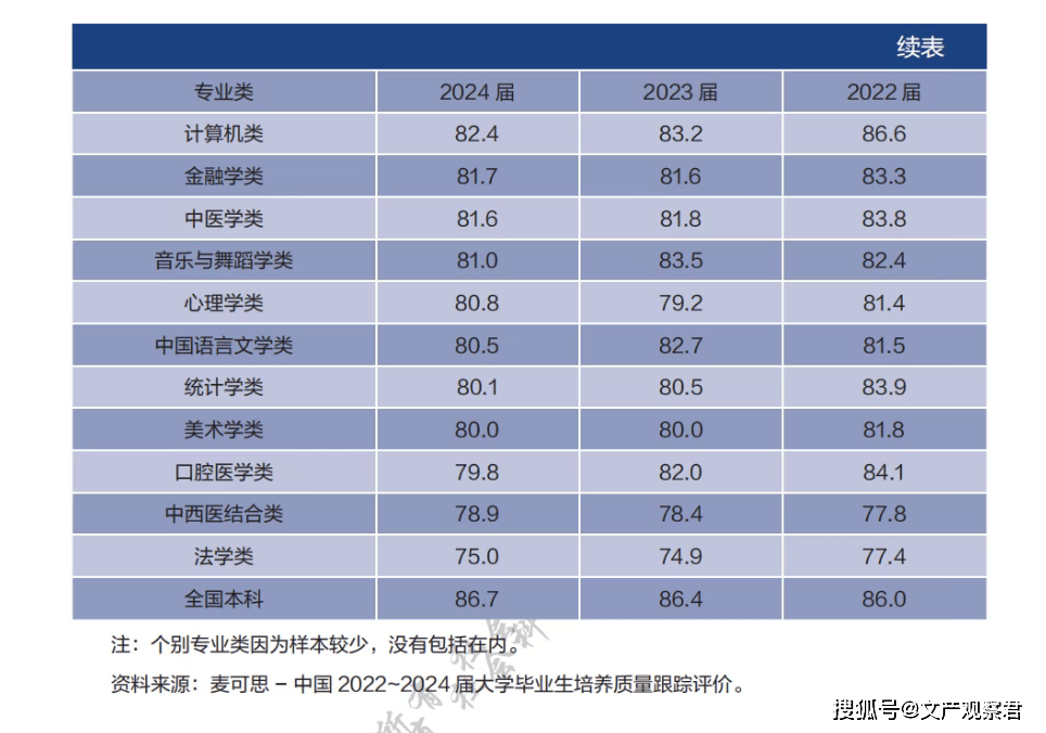 麦可思研究院《2025年中国本科生就业报告》中关于“2022-2024届本科主要专业类毕业生毕业半年后的去向落实率”的统计显示,2024届计算机类毕业生去向落实率仅有82.4%,在61个主要专业类中排名倒数第十一,显著低于全国本科平均水平的86.7%。