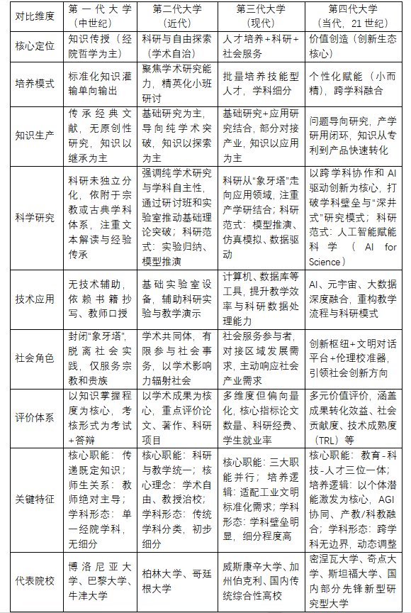第四代大学并非对前三代大学的简单否定或替代,而是在数字文明的新基座上对大学“人才培养、科学研究、社会服务”三大经典职能进行系统性重构和升华,本质上是技术革命、教育范式与社会需求迭代共同作用的结果。