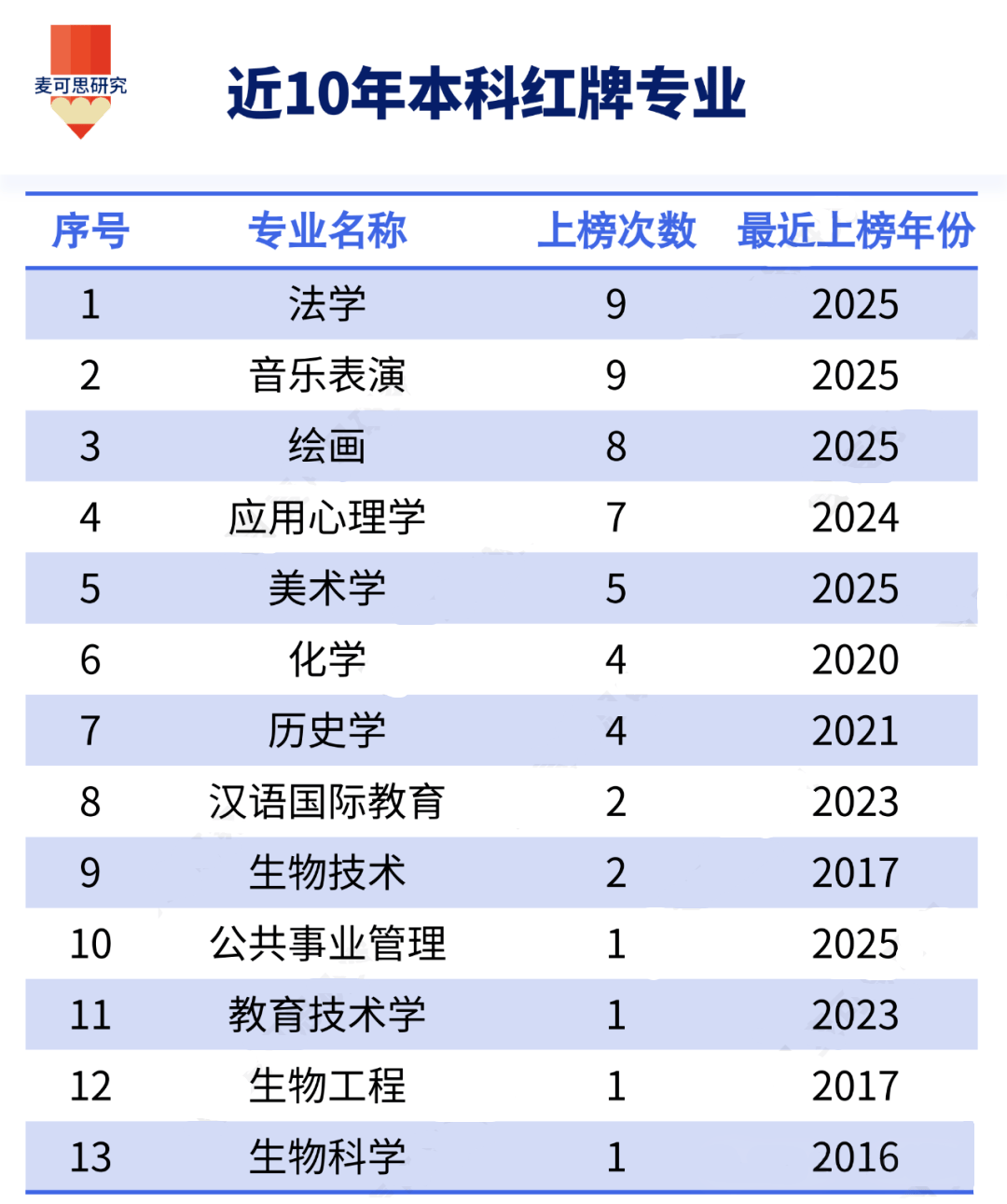 就业蓝皮书显示,最近10年(2016至2025年),法学、音乐表演、绘画、应用心理学、美术学、化学、历史学、汉语国际教育、生物技术、公共事业管理、教育技术学、生物工程、生物科学等13个专业进入了本科红牌专业名单。