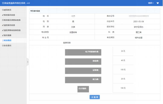 13.点击确定后进入(图12),系统会根据考生填报的基本信息,列出所需缴纳的费用清单,此处考生一定要确保自己填报信息的准确性,例如是“全国统考生”还是“中等职业学校对口招生”,是否“民考民、民考汉考生”(是的话使用对应的民族试卷)等。