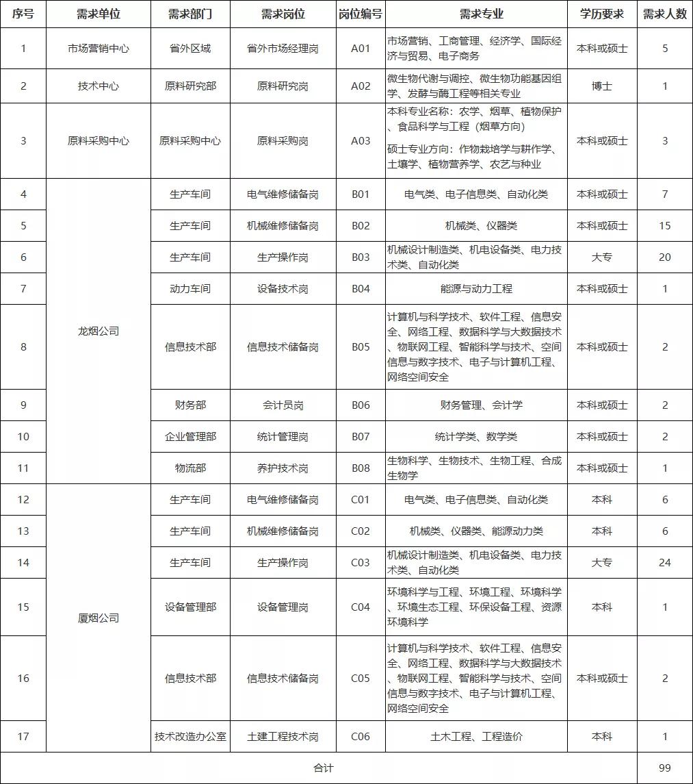 根据2021年福建省烟草公司发布的部分社会招聘情况来看,招聘岗位中仅部分岗位面向烟草专业毕业生,反倒是电气、机械、经贸类等专业的招聘人员更多。对于学历上的要求,仅生产操作岗最低是大专,其他大都要求本科或硕士,部分学历要求为博士。
