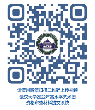 考生在教育部“阳光高考平台”报名完成后,需在2021年12月20日10:00至12月27日16:00期间上传音像资料。考生需将与报考项目相关的艺术特长制作成声音、图像清晰的MP4或AVI格式的音像资料,时长不超过10分钟,整个录制过程需保证真实性、原始性,不得切换镜头拍摄或进行后期编辑加工,不得出现任何与考生有关的个人信息;并将上述音像资料以“报名号+考试项目”的文件名上传至武汉大学2022年高水平艺术团资格审查材料提交系统(https://whu.gaokaobaoming.com,二维码附后)。未按要求完成报名、报名材料不符合要求、音像资料不能播放等情况,一律视作报名无效。
