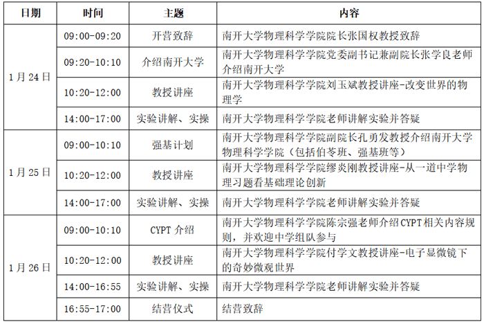 为响应教育部2020年1月17日颁布的《关于在部分高校开展基础学科招生改革试点工作的意见》,打通高中教育与大学教育的衔接,强化高中教育阶段物理学科学生培养,提升高中学生的物理学科素养,拓宽学科视野,南开大学物理科学学院将于2022年1月举办物理学科寒假营地活动,并面向全国各地优秀高中学子开放。希望通过寒假营地活动的举办促进大学与中学间的交流互动,加深中学生对南开大学物理学科专业的了解,深度体验大学研究式的学习方式,激发对物理学科的学习兴趣,并引导优秀学生立志进入重点高校从事基础物理研究。