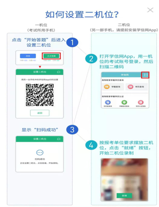 (3)“一机位”手机在点击【排练】或【正式答题】后显示设置“二机位”的二维码。用另一部手机(“二机位”手机,请提前安装学信网APP并使用相同的账号登录)进入APP首页点击右上角的扫一扫,扫码成功并按要求摆放二机位手机,点击【就绪】后二机位开始录制。“一机位”手机点击【开始录制】后,“一机位”开始录制。