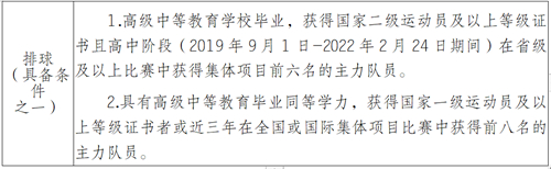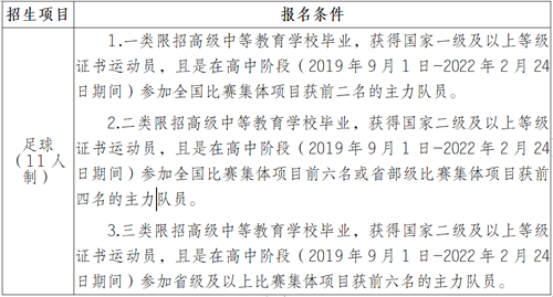 一类:参加国家体育总局统一组织的单独招生文化课考试,文化课成绩须达到学校划定的文化成绩合格线。由本人申请、考生所在省级招办核准后可免于参加全国普通高等学校招生统一文化考试。我校确定并公示的此类考生拟录取人数不超过学校2022年高水平运动队招生计划的20%。我校足球项目还必须同时满足在高中阶段(2019年9月1日-2022年2月24日期间)为全国比赛集体项目前二名的主力队员。