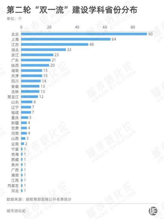 从学科区域分布来看,即使不算清华、北大两所头部高校(自主设置),北京的“双一流”建设学科也高达90个,是实至名归的高等教育“第一城”。