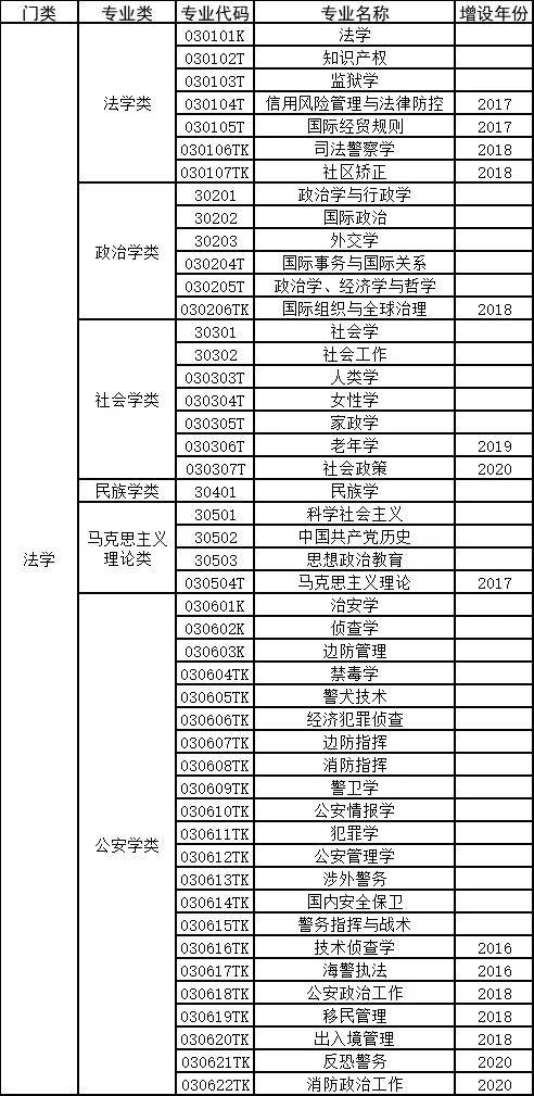法学门类下有法学、政治学、社会学、民族学、马克思主义理论、公安学等几类专业。