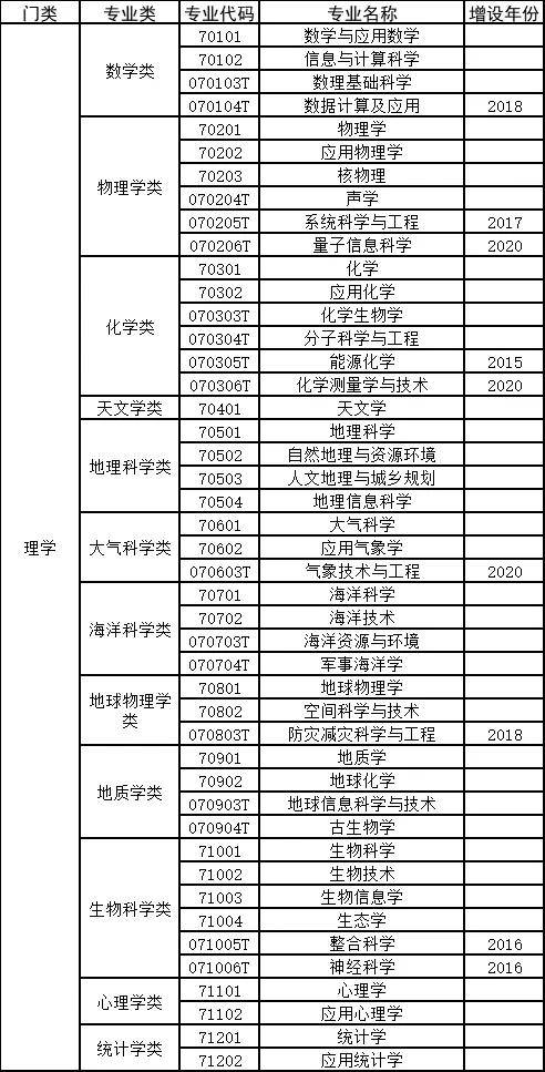 理学门类下设数学、物理学、化学、天文学、地理科学、大气科学、海洋科学、地球物理学、地质学、生物科学、心理学、统计学等几类专业。