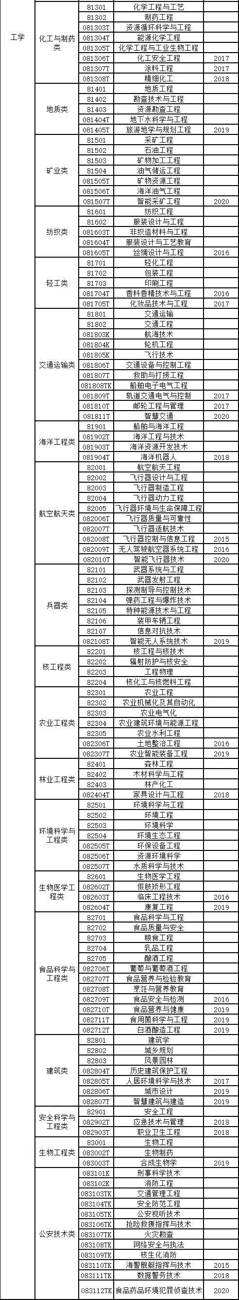 工学门类下有力学、机械、仪器、材料、能源动力、电气、电子信息、自动化、计算机、土木、水利、测绘、化工与制药、地质、矿业、纺织、轻工、交通运输、海洋工程、航空航天、兵器、核工程、农业工程、林业工程、环境科学与工程、生物医学工程、食品科学与工程、建筑、安全科学与工程、生物工程、公安技术等数十类专业。