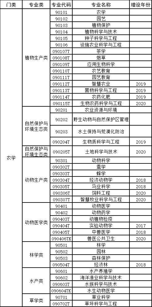 农学门类下有植物生产、自然保护与环境生态、动物生产、动物医学、林学、水产、草学等几类专业。