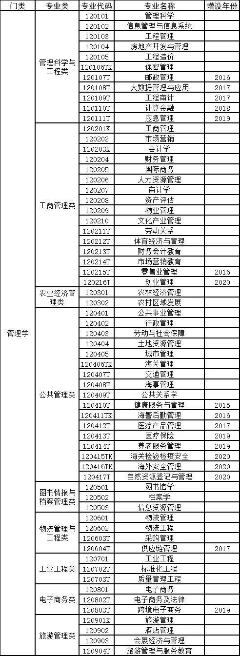 管理学门类下有管理科学与工程、工商管理、农业经济管理、公共管理、图书情报与档案管理、物流管理与工程、工业工程、电子商务、旅游管理等9类专业,具体专业有数十个。