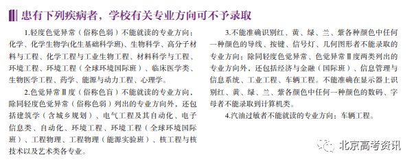 3、不能准确识别红、黄、绿、蓝、紫各种颜色中任何一种颜色的导线、按键、信号灯、几何图形者不能录取的专业: