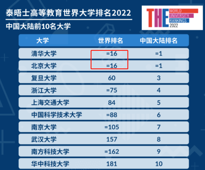 清北在我国有绝对的高校地位,但是在全球高校排名中,却排不上数,在2022年泰晤士全球高校排行榜中,清华北大并驾齐驱排在第16名。