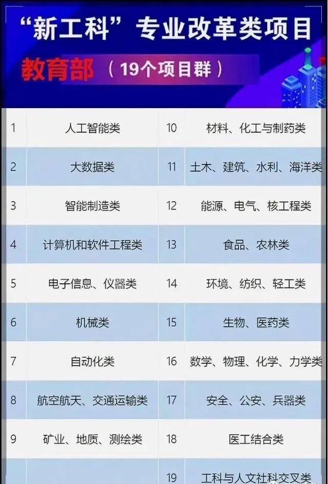 通过上表的目录显示,我们可以看到,这19个“新工科”项目群,基本上涵盖了当下比较火的热门专业,尤其是当下非常受市场青睐的人工智能类、大数据类、智能制造类、计算机和软件工程类、电子信息、仪器类等6个大类。