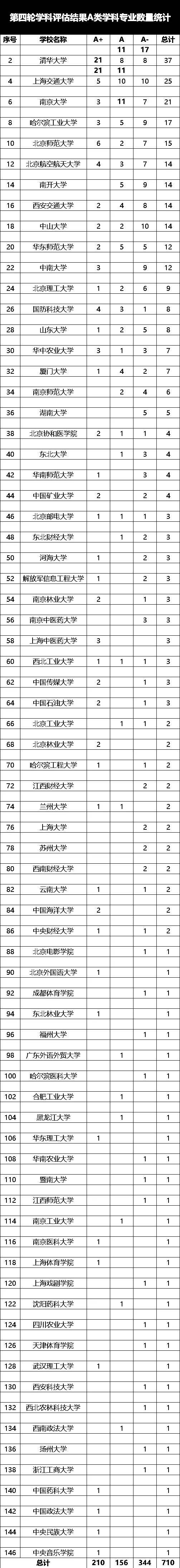 在第四轮学科评估中,共有210个院校专业评级为A+,156个专业为A,344个专业为A-。其中,清北A+类专业数量最多有21个;北大、南京大学及浙大A类专业数量最多有11个;此外,浙江大学A-类专业数量最多有17个。下表A类学科专业数量统计: